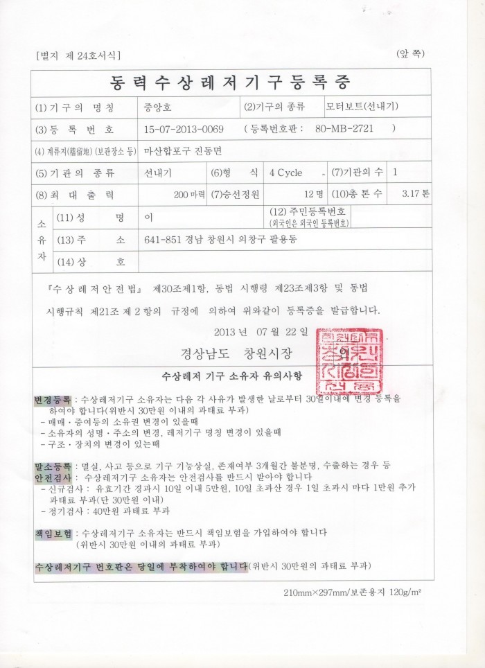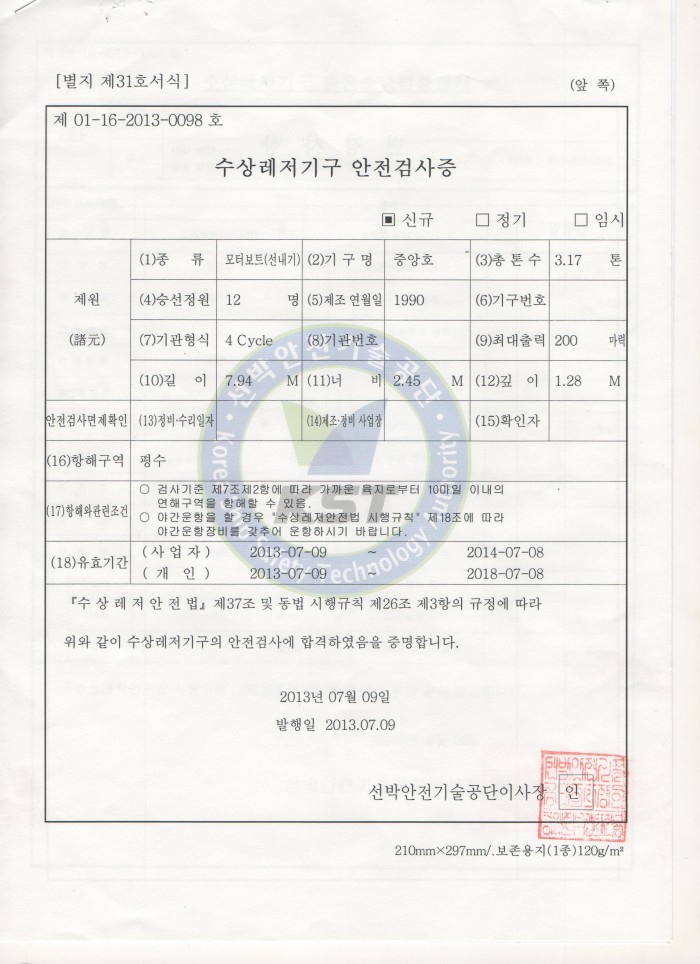 등록증, 안전검사증 첨부했습니다.